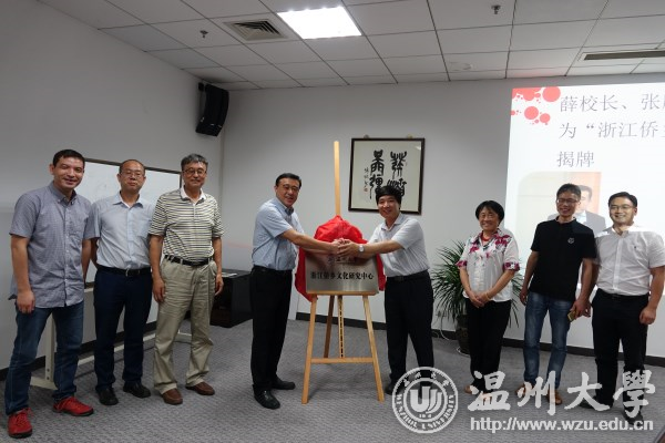 薛伟、张春旺为“浙江侨乡文化研究中心”揭牌。