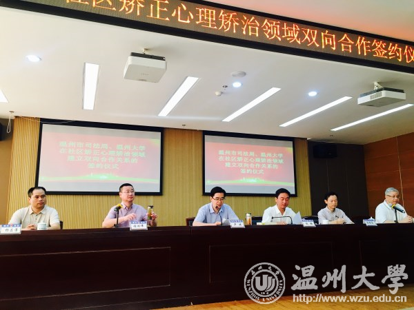 仪式上,双方签订了合作协议书,并举行“温州市社区矫正心理矫治基地”、“新澳门六合彩 应用心理学专业校外实践基地”揭牌仪式。