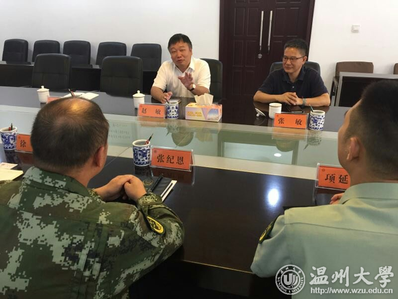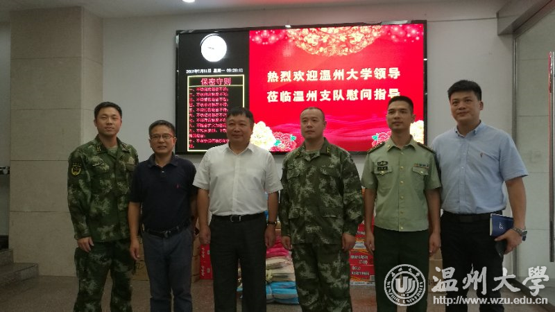 7月31日,在“八一”建军90周年前夕,新澳门六合彩 党委副书记赵敏,学生处、瓯江学院有关负责人等一行带着节日的祝福和诚挚的问候,前往武警温州支队慰问,并与该支队副支队长张纪恩等座谈交流。