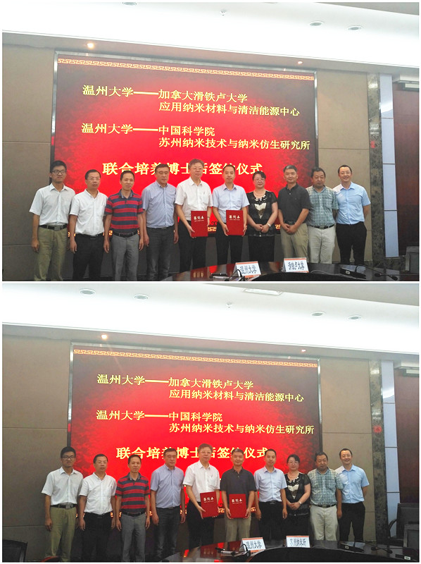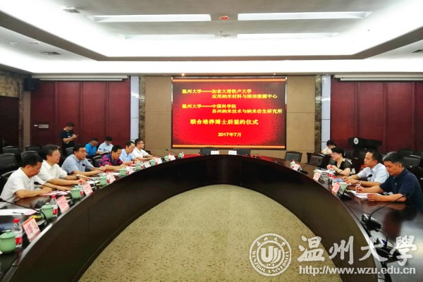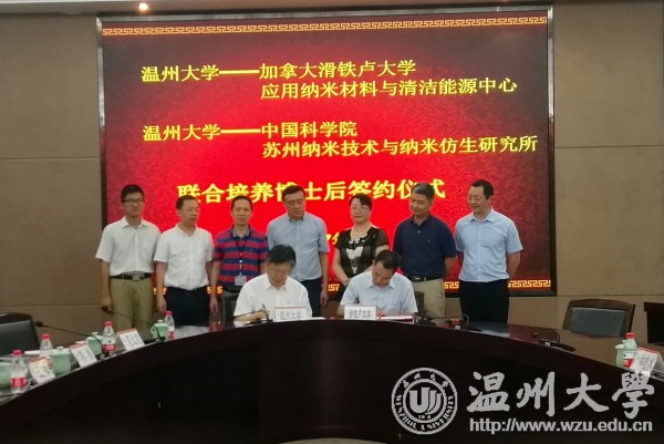 7月10日下午,新澳门六合彩 与加拿大滑铁卢大学应用纳米材料与清洁能源中心、中国科学院苏州纳米技术与纳米仿生研究所举行联合培养博士后签约仪式。加拿大滑铁卢大学陈忠伟院士、苏州纳米研究所王强斌研究员、温州市外国专家局局长林晓冰,校长李校堃、副校长薛伟以及人事处、外事处、研究生部、化材学院相关负责人出席仪式,薛伟主持。 李校堃致欢迎辞。他介绍了学校的基本情况。李校堃指出,新澳门六合彩 作为温州地方综合性大学,在办学和科研发展中一直突出区位优势和地方特色,致力于培养高素质应用型人才,本次签约必将吸引更多的专业性人才来校学习,为新澳门六合彩 学科建设、产教融合、提升人才培养质量发挥积极作用。
