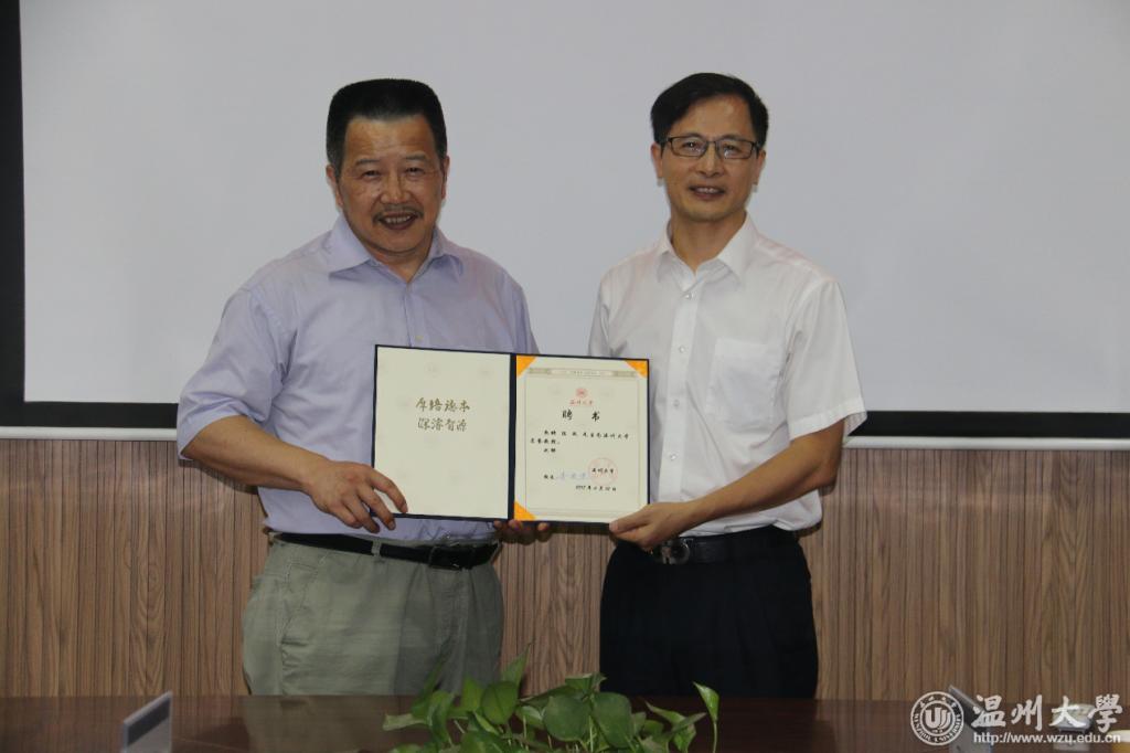 日前,新澳门六合彩 在化材楼11B204会议室举行敦聘仪式,聘任教育部长江学者、宁波诺丁汉大学陈政教授为新澳门六合彩 名誉教授。副校长方益权、化材学院有关负责人等参加仪式。