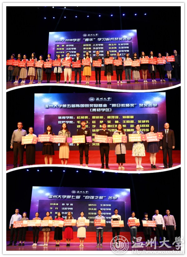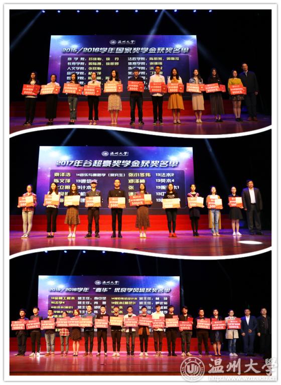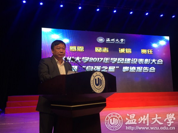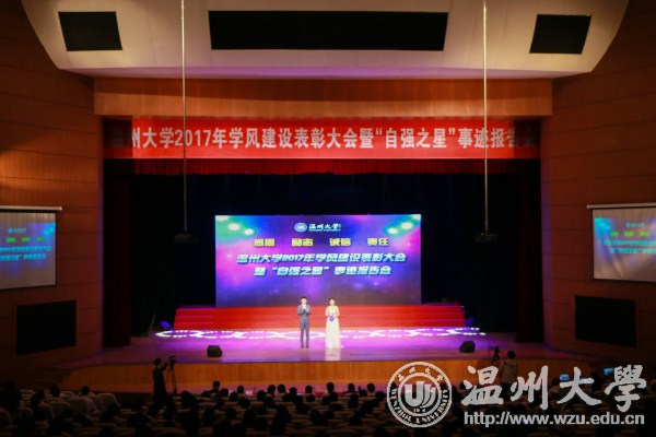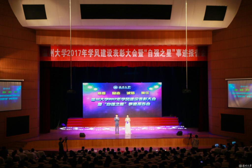4月26日下午,新澳门六合彩 2017年学风建设表彰大会暨“自强之星”事迹报告会在大学生活动中心育英大礼堂举行。校领导牟德刚、赵敏、吴金法、蔡曙光、方益权、潘玉驹,校友、浙江红绿蓝教育集团董事长陈国同,浙江嘉华房地产有限公司总经理陈耀兴,阿联酋温州同乡会执行会长池云虎一行,相关部门负责人,各学院、学区分管书记,全体辅导员,相关班主任,学生代表参加大会。