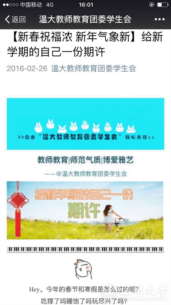 “新春祝福浓,新年气象新!”新学期开学之前,教师教育学院在学院团学微信平台上推出“给新学期的自己一份期许”专栏。“希望时光跑得慢一点,愿岁月中可爱的人们都能好好生活。”“希望新的一年,我可以少计较一点得失,多包容一些。”“到了一个必须要长大的尴尬年纪,希望自己学会努力之后的妥协,学会心疼爸妈珍惜朋友和时光。加油吧加油吧!”……即将返校的学生纷纷在微信上留言,表达自己对新学期的期许。学院大楼各楼层、各宣传栏、祝福墙,也是布置一新,更加衬托出“博爱雅艺”的教、学、研氛围。最值得一提的是,学院关注、关爱、关怀学生,为迎接开学初的国家教师资格证考试,在寒假期间就组织安排为学生进行强化训练。