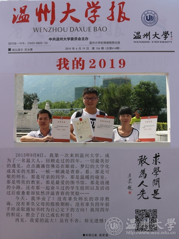 让毕业时的自己上头条 在南校报到处,学校放置一张2019年6月刊出的一份“新澳门六合彩 报”,而这一期的校报头条新闻里的主角,则是刚刚报到的2015级新生,他们手捧各类荣誉证书,有“华峰品德奖”、“国家奖学金一等奖”、“全国挑战杯金奖”、“省优秀毕业生”等等。 “我希望4年后的自己真的能达到这些目标。”“为了达到目标,这四年我一定好好努力。”“我为自己加油!”新生们兴奋地说。 “给每位新生一次上‘新闻头条’的机会,让他们和未来的自己拍个照,和未来的成就合个影。学校从新生报到入学的第一天,就引导新生关注和思考四年的大学路该怎么走,提早规划设计自己的职业生涯,为自己的人生负责。”宣传部部长潘玉驹说。