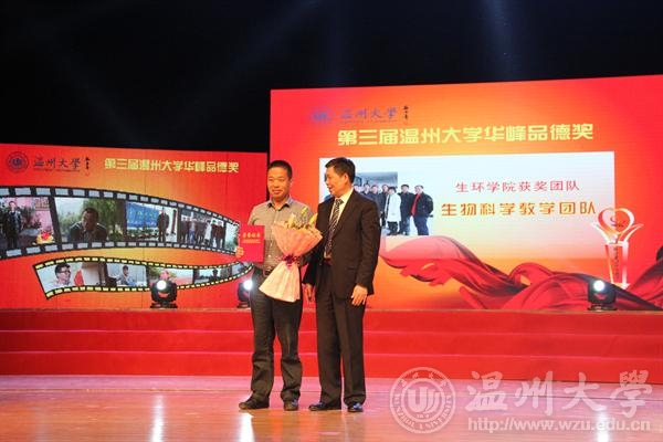 华峰集团党委书记周品英为生物科学教学团队代表颁奖。
