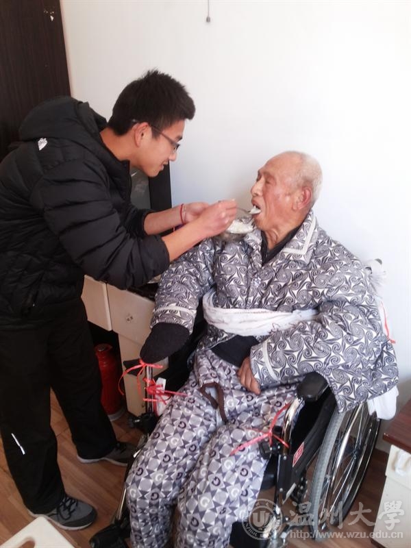 图为志愿者为敬老院行动不便的老人喂饭。 美术与艺术设计学院 供