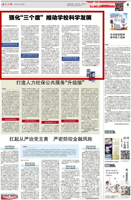 三是强化把方向、谋大局、定战略,把党对学校事业发展的政治引领与保障作用落到实处。学校党委深入学习贯彻全国教育大会精神,深入开展大学习大调研大抓落实系列活动,进一步明确学校当前改革发展的战略目标和主攻方向是创建省重点建设高校,获得博士学位授予权,努力把学校建设成为具有鲜明地域特色、国内知名的教学研究型大学。