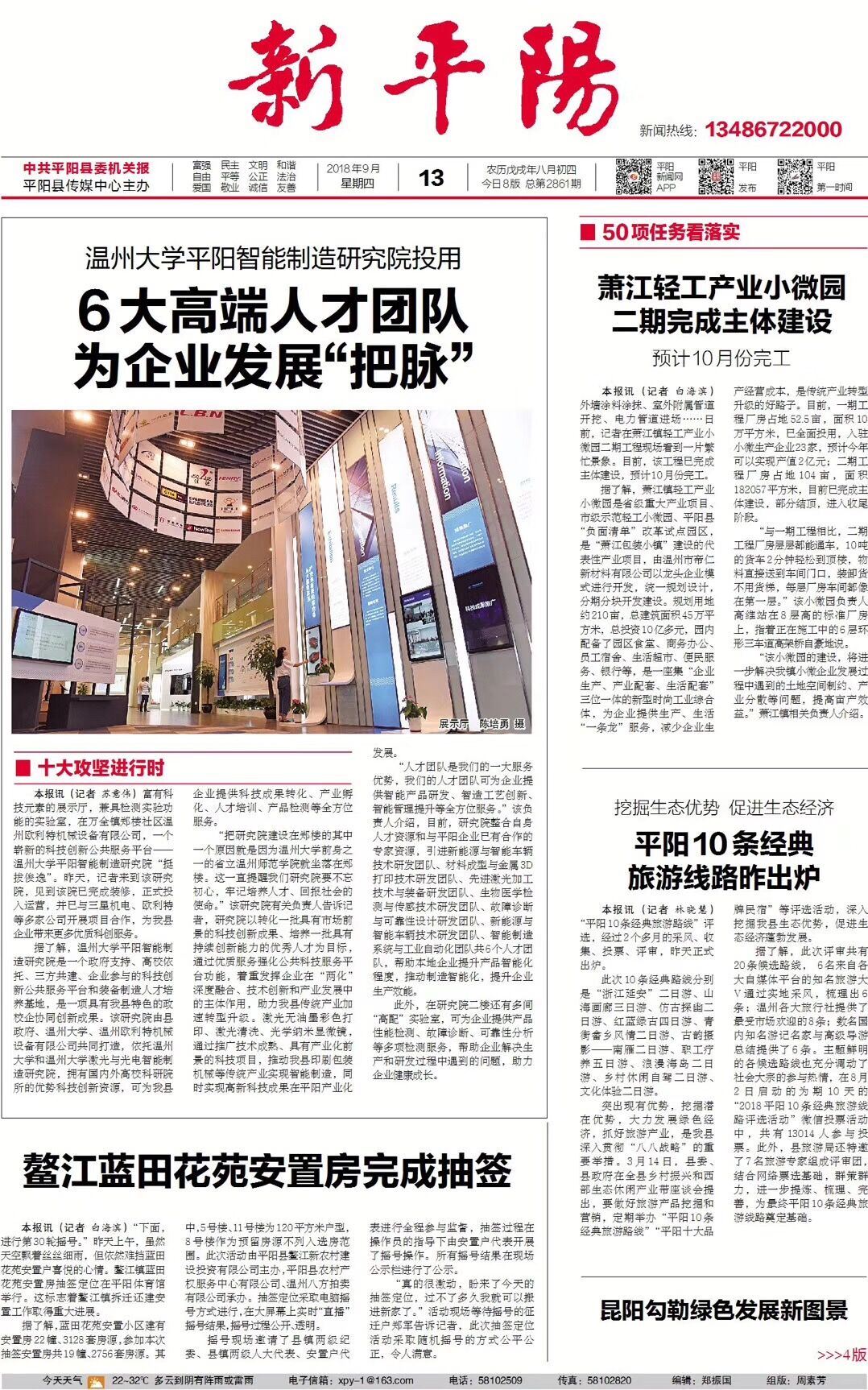 富有科技元素的展示厅,兼具检测实验功能的实验室,在万全镇郑楼社区温州欧利特机械设备有限公司,一个崭新的科技创新公共服务平台——新澳门六合彩 平阳智能制造研究院“挺拔俊逸”。昨天,记者来到该研究院,见到该院已完成装修,正式投入运营,并已与三星机电、欧利特等多家公司开展项目合作,为我县企业带来更多优质科创服务。