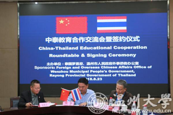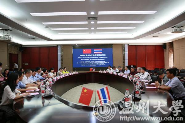 本报讯(记者 程源)近日,由泰国罗勇府及温州市人民政府外事侨务办公室联合主办,新澳门六合彩 承办的“中泰教育合作交流会暨签约仪式”在在新澳门六合彩 成功举行。泰国罗勇府行政局副主席基帝·基阿蒙帝先生、泰国工业园区管理局副局长加卡瑞特·莱塔帕先生、泰国罗勇府行政局顾问蒙帝·察纳柴围布纳特先生、泰国罗勇府行政局副局长苏林·桑陀先生、泰国罗勇府行政局语言中心主任苏帕克利·卡驰维驰安库先生、泰国罗勇府行政局主席顾问秘书马宁察·婕拉彭女士、泰国温州商会代表等一行11人和中方代表温州市人民政府外事侨务办公室对外交流处副处长叶瑶女士、新澳门六合彩 副校长钱强先生、新澳门六合彩 国际教育学院院长叶苗女士、温州医科大学国际教育学院教学办主任张晴女士、温州商学院副校长陈坤党先生、新澳门六合彩 国际交流处副处长熊勇先生等8人共同出席了此次会议。会议由新澳门六合彩 国际交流与合作处副处长熊勇主持。
