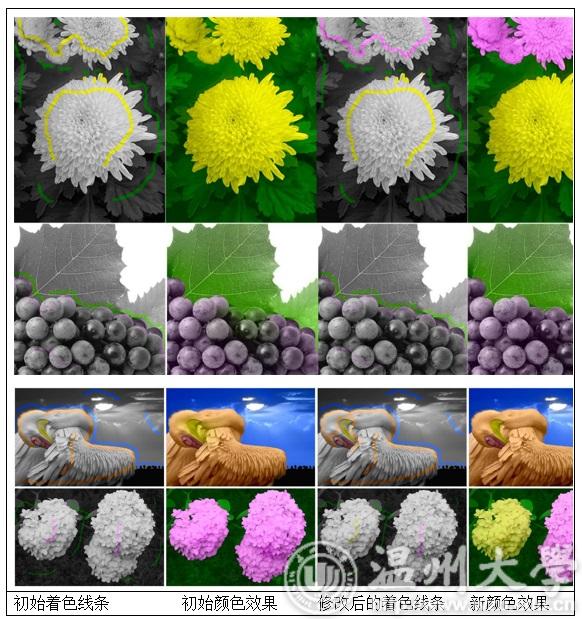 赵汉理科研团队不断地探索新的交互式图像颜色编辑技术,在处理过程中将图像RGB颜色空间扩展为高维度的视觉特征空间(包括颜色、纹理、像素坐标等信息),较好地克服了现有方法所存在的缺点,并且取得了一定的研究进展。首先,对图像中每个像素的纹理特征进行量化表示,在颜色优化函数中增加纹理特征项,使线条颜色能有效地传播到周围纹理相似区域而不会渗透到区域边界以外的其他图像区域。其次,在颜色优化函数中增加二维图像空间坐标项,使得线条颜色不仅能够传播到线条所在区域,还能够传播到与该区域不相邻但纹理特征相似的其他图像区域。交互式颜色编辑效果对比如下图所示,对比效果1和对比效果2为其他方法的计算结果,可以看出赵汉理科研团队的新方法能够获得与原彩色图相接近的颜色分布。