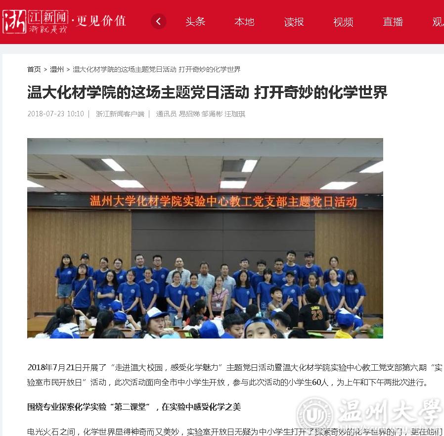 2018年7月21日开展了“走进新澳门六合彩 校园,感受化学魅力”主题党日活动暨新澳门六合彩 化材学院实验中心教工党支部第六期“实验室市民开放日”活动,此次活动面向全市中小学生开放,参与此次活动的小学生60人,为上午和下午两批次进行。