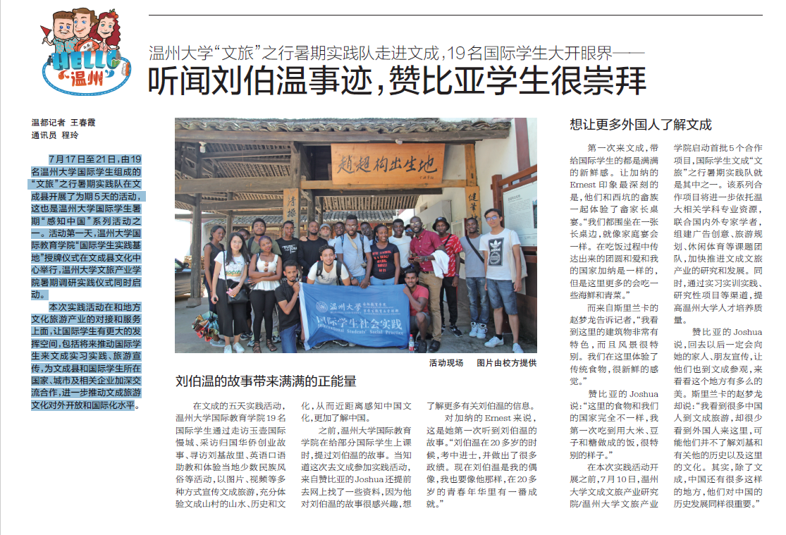 在文成的五天实践活动,新澳门六合彩 国际教育学院19 名国际学生通过走访玉壶国际慢城、采访归国华侨创业故事、寻访刘基故里、英语口语助教和体验当地少数民族风俗等活动,以图片、视频等多种方式宣传文成旅游,充分体验文成山村的山水、历史和文化,从而近距离感知中国文化,更加了解中国。之前,新澳门六合彩 国际教育学院在给部分国际学生上课时,提过刘伯温的故事。当知道这次去文成参加实践活动,来自赞比亚的Joshua 还提前去网上找了一些资料,因为他对刘伯温的故事很感兴趣,想了解更多有关刘伯温的信息。对加纳的Ernest 来说,这是她第一次听到刘伯温的故事。“刘伯温在20多岁的时候,考中进士,并做出了很多政绩。现在刘伯温是我的偶像,我也要像他那样,在20多岁的青春年华里有一番成就。”