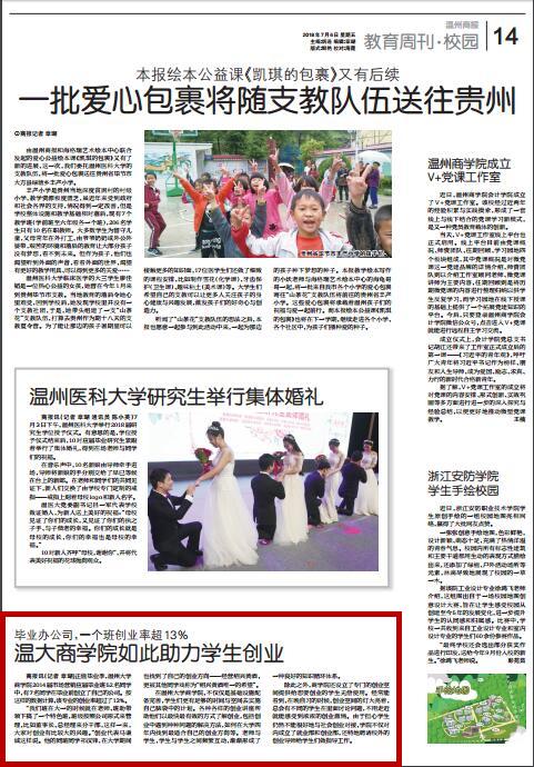 正值毕业季,新澳门六合彩 商学院2014届市场营销应届毕业班52名同学 中,有7名同学在毕业前创立了自己的公司。按 这样的数据计算,该专业的创业率超过了13%。 “我们班在大一的时候就在老师、班助带 领下搞了一个特色班,班级按照公司形式来管 理,比如董事长、总经理来分干部,这样一来, 大家对创业有比较大的兴趣。”创业代表马谦 诚这样说。他的同班同学祁汉锋,在大学期间 也找到了自己的创业方向——经营绍兴黄酒, 更被其他同学戏称为“绍兴黄酒唯一的希望”。 在新澳门六合彩 商学院,不仅仅是基础设施配 备完善,学生们更有足够的时间与空间去实施 自己脑袋中的计划。各种各样的创业讲座帮 助他们以最快最有效的方式了解创业,包括创 业中遇到种种问题的解决方法,如何在大学四 年内找到最适合自己的创业方向等。老师与 学生,学生与学生之间频繁互动,渐渐形成了 一种良好的知识循环体系。 除此之外,商学院还设立了专门的创业空 间提供给想要创业的学生无偿使用。经常能 看到,在晚自习的时候,创业空间的灯大亮着, 总会有不同的学生在里面讨论问题,不用走近 就能感受到浓浓的创业激情。由于担心学生 仍然不能很好地与社会创业对接,学院不仅对 内成立了就业部和创业部,还特地聘请校外的 创业导师给学生们做指导工作。