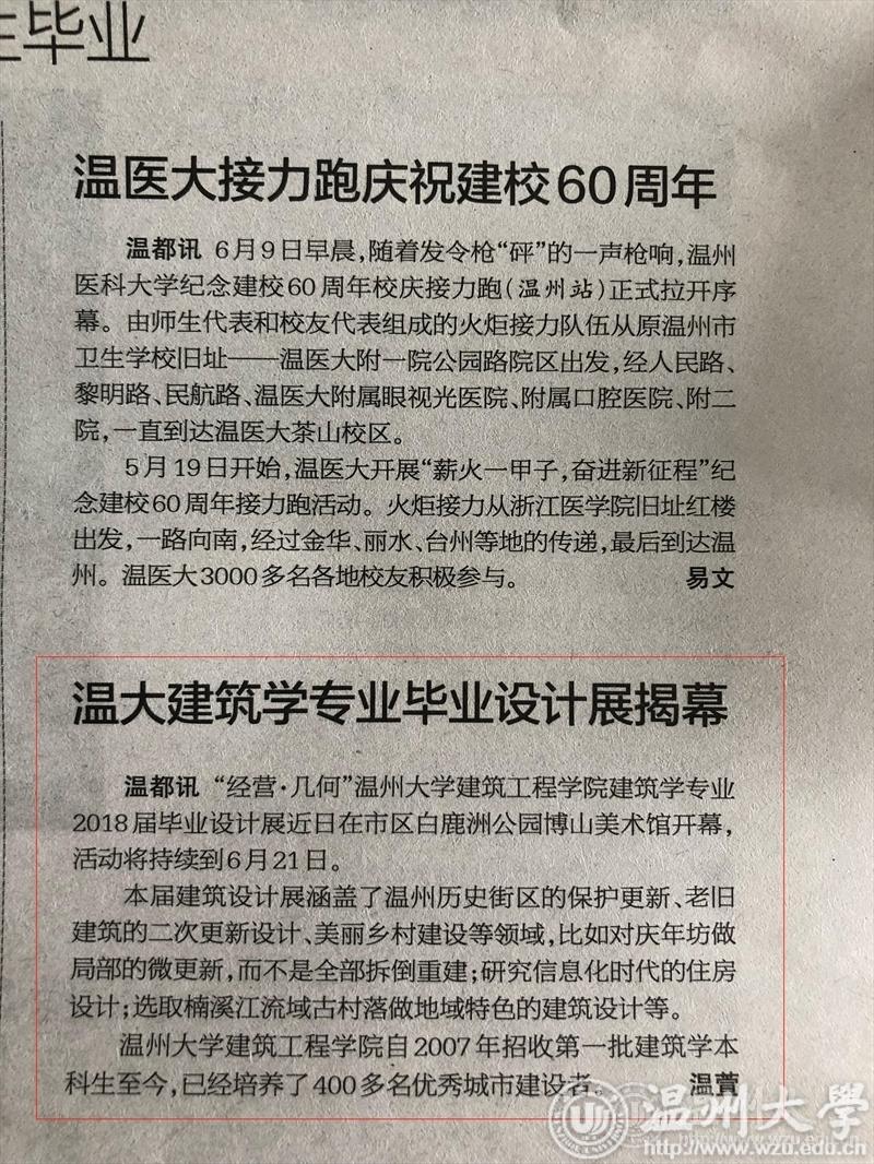 “经营几何'新澳门六合彩 建筑工程学院建筑学专业2018届毕业设计展近日在市区白鹿洲公园博山美术馆开幕,活动将持续到6月21日。 本届建筑设计展涵盖 了温州历 史街区的保护更新、老旧建筑的二次更新设计美丽乡村建设等领域,比如对庆年坊做局部的微更新,而不是全部拆倒重建;研究信息化时代的住房设计;选取楠溪江流域古村落做地域特色的建筑设计等。 新澳门六合彩 建筑工程学院自2007年招收第一批建筑学本科生至今,已经培养了400多名优秀城市建设者。