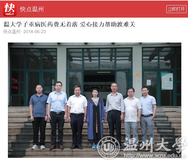 此后,长达两年的时间,既是李萍与病魔抗争的时间,亦是新澳门六合彩 师生接力陪跑的时间。新澳门六合彩 师生成立了“萍生救助团队”,联系温州都市报、温州市红十字会、新澳门六合彩 校友会等社会力量积极募捐,并通过“轻松筹”、亲青筹等平台发起网络爱心募捐,一时间,为李萍捐款的消息瞬间刷爆了朋友圈和空间。91岁高龄的新澳门六合彩 原党委书记李方华从报纸上看到李萍的消息当即决定捐赠3万元。最终,学院学校师生及个人、新澳门六合彩 校友会、瓯海慈善总会、市红十字会、张汉鸣基金以及爱心市民为李萍募集善款,共计36万元。