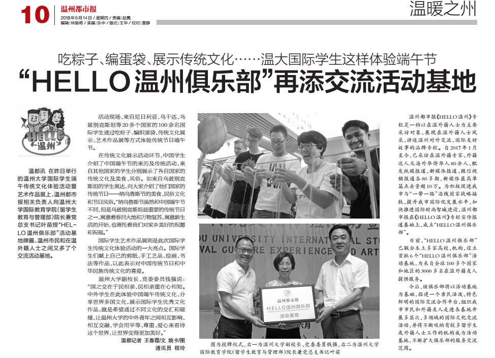 温都讯 在昨日举行的新澳门六合彩 国际学生端午传统文化体验活动暨艺术作品展上,温州都市报相关负责人向新澳门六合彩 国际教育学院(留学生教育与管理部)院长兼党总支书记叶苗授“HELLO 温州俱乐部”活动基地牌匾,温州市民和在温外籍人士之间又多了个交流活动基地。