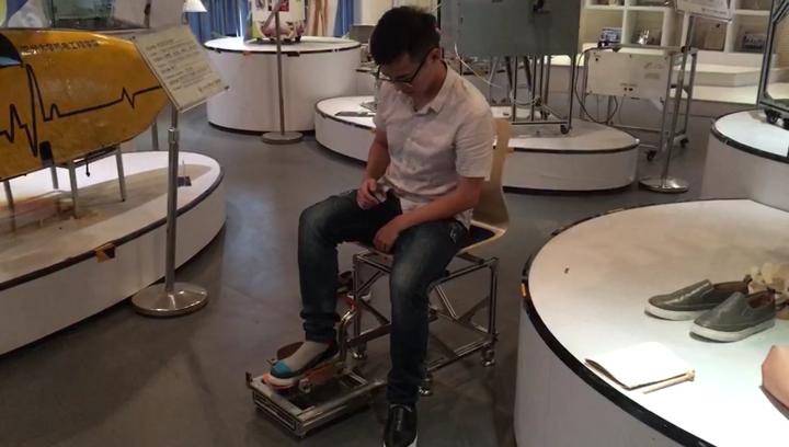 在新澳门六合彩 机电工程学院,记者看到了这台“脱穿鞋一体机”。从外观上看,这台一体机就是一把椅子,但它真正的“玄机”在椅子下方,使用的时候把机器从椅子下方拉出即可。