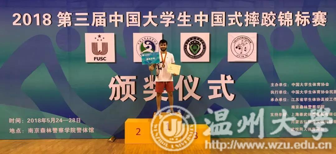 上月底,在南京举行的的第三届中国大学生中国式摔跤锦标赛中,新澳门六合彩 国际教育学院学生卢思谈获得男子甲组70公斤季军。本届比赛吸引了来自全国各地37所高校代表队的459人参赛,卢思谈是温州代表队唯一一位外国选手,谁都不曾想到,这个外国小伙子接触中国式摔跤才2个来月。