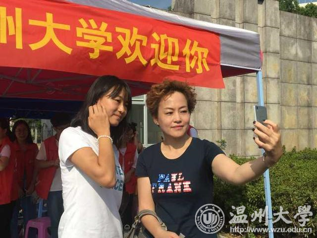 ▲45岁的吴静春和15岁的杨尚萍在迎新点自拍,两人分别是今年年纪最大和最小的大一新生,也打破了新澳门六合彩 年龄最大和最小新生记录。