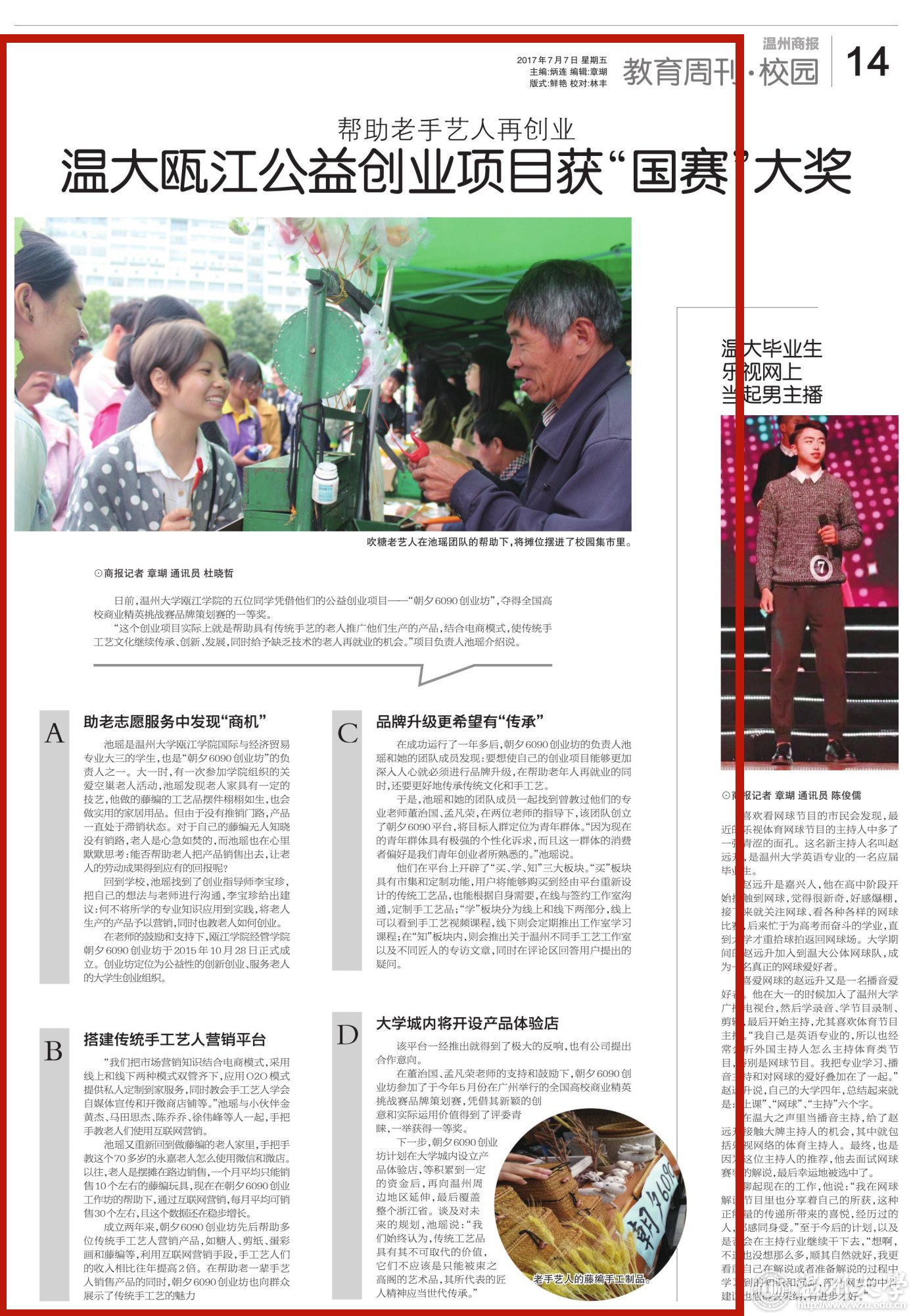 日前,新澳门六合彩 瓯江学院的五位同学凭借他们的公益创业项目——“朝夕6090创业坊”,夺得全国高校商业精英挑战赛品牌策划赛的一等奖。 “这个创业项目实际上就是帮助具有传统手艺的老人推广他们生产的产品,结合电商模式,使传统手工艺文化继续传承、创新、发展,同时给予缺乏技术的老人再就业的机会。”项目负责人池瑶介绍说。 助老志愿服务中发现“商机” 池瑶是新澳门六合彩 瓯江学院国际与经济贸易专业大三的学生,也是“朝夕6090创业坊”的负责人之一。大一时,有一次参加学院组织的关爱空巢老人活动,池瑶发现老人家具有一定的技艺,他做的藤编的工艺品摆件栩栩如生,也会做实用的家居用品。但由于没有推销门路,产品一直处于滞销状态。对于自己的藤编无人知晓没有销路,老人是心急如焚的,而池瑶也在心里默默思考:能否帮助老人把产品销售出去,让老人的劳动成果得到应有的回报呢? 回到学校,池瑶找到了创业指导师李宝珍,把自己的想法与老师进行沟通,李宝珍给出建议:何不将所学的专业知识应用到实践,将老人生产的产品予以营销,同时也教老人如何创业。 在老师的鼓励和支持下,瓯江学院经管学院朝夕6090创业坊于2015年10月28日正式成立。创业坊定位为公益性的创新创业、服务老人的大学生创业组织。 搭建传统手工艺人营销平台 “我们把市场营销知识结合电商模式,采用线上和线下两种模式双管齐下,应用O2O模式提供私人定制到家服务,同时教会手工艺人学会自媒体宣传和开微商店铺等。”池瑶与小伙伴金黄杰、马田思杰、陈乔乔、徐伟峰等人一起,手把手教老人们使用互联网营销。 池瑶又重新回到做藤编的老人家里,手把手教这个70多岁的永嘉老人怎么使用微信和微店。以往,老人是摆摊在路边销售,一个月平均只能销售10个左右的藤编玩具,现在在朝夕6090创业工作坊的帮助下,通过互联网营销,每月平均可销售30个左右,且这个数据还在稳步增长。 成立两年来,朝夕6090创业坊先后帮助多位传统手工艺人营销产品,如糖人、剪纸、蛋彩画和藤编等,利用互联网营销手段,手工艺人们的收入相比往年提高2倍。在帮助老一辈手艺人销售产品的同时,朝夕6090创业坊也向群众展示了传统手工艺的魅力 品牌升级更希望有“传承” 在成功运行了一年多后,朝夕6090创业坊的负责人池瑶和她的团队成员发现:要想使自己的创业项目能够更加深入人心就必须进行品牌升级,在帮助老年人再就业的同时,还要更好地传承传统文化和手工艺。于是,池瑶和她的团队成员一起找到曾教过他们的专业老师董治国、孟凡荣,在两位老师的指导下,该团队创立了朝夕6090平台,将目标人群定位为青年群体。“因为现在的青年群体具有极强的个性化诉求,而且这一群体的消费者偏好是我们青年 创业者所熟悉的。”池瑶说。 他们在平台上开辟了“买、学、知”三大板块。“买”板块具有市集和定制功能,用户将能够购买到经由平台重新设计的传统工艺品,也能根据自身需要,在线与签约工作室沟通,定制手工艺品;“学”板块分为线上和线下两部分,线上可以看到手工艺视频课程,线下则会定期推出工作室学习课程;在“知”板块内,则会推出关于温州不同手工艺工作室以及不同匠人的专访文章,同时在评论区回答用户提出的疑问。 大学城内将开设产品体验店 该平台一经推出就得到了极大的反响,也有公司提出合作意向。 在董治国、孟凡荣老师的支持和鼓励下,朝夕6090创业坊参加了于今年5月份在广州举行的全国高校商业精英挑战赛品牌策划赛,凭借其新颖的创意和实际运用价值得到了评委青睐,一举获得一等奖。 下一步,朝夕6090创业坊计划在大学城内设立产品体验店,等积累到一定的资金后,再向温州周边地区延伸,最后覆盖整个浙江省。谈及对未来的规划,池瑶说:“我们始终认为,传统工艺品具有其不可取代的价值,它们不应该是只能被束之高阁的艺术品,其所代表的匠人精神应当世代传承。” 相关链接: 温州商报://www.wzrb.com.cn/article794222show.html