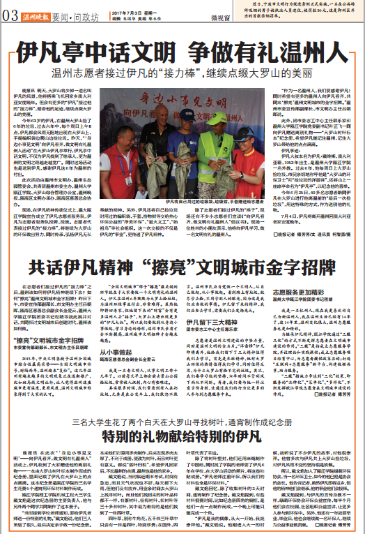 明天,大罗山将少掉一道名叫伊凡的风景,他将搭乘飞机回家乡澳大利亚安度晚年。但会有更多的“伊凡”接过他的“接力棒”,循着他的足迹,继续点缀大罗山的美丽。 今年63岁的伊凡,在温州大罗山捡了6年的垃圾,过去六年中,每个周日上午8点,伊凡都会风雨无阻地出现在大罗山上,手提编织袋边爬山边捡垃圾。昨天,“‘身边小事见文明’向伊凡看齐,做文明有礼温州人活动”在大罗山伊凡亭举行,伊凡亭中话文明,不仅为伊凡找到了继承人,更为温州的文明之路越走越宽广。同时这场活动也是送别伊凡,感谢伊凡这6年为温州的付出。 此次活动由温州市文明办、温州生态园管委会、共青团温州市委主办,新澳门六合彩 瓯江学院、大罗山综合管理办公室、温州晚报、瓯海区文明办承办,瓯海区慈善总会协办。 现场,在伊凡精神传承仪式上,新澳门六合彩 瓯江学院宣告成立了伊凡志愿者服务队,伊凡为志愿者服务队授牌、授旗。志愿者代表接过伊凡的“接力棒”,将继续为大罗山的环保做出努力,同时传承、弘扬伊凡无私奉献的精神。另外,伊凡还将自己捡垃圾时用过的编织袋、手套、拾物钳等交给热心环保公益的“净美环保”、“星火义工”、“始祖鸟”等社会组织。这一次交接的不仅是伊凡的“事业”,更传递了伊凡精神。 除了志愿者们接过伊凡的“棒子”,现场还有不少小志愿者们宣读《“向伊凡看齐,做文明有礼温州人”倡议书》。现场一位姓林的小朋友表示,他将向伊凡学习,做一名文明有礼的温州人。 “作为一名温州人,我们要感谢伊凡!同时希望有更多的温州人向伊凡看齐,共同来‘擦亮’温州文明城市的金字招牌。”温州市委宣传部副部长、市文明办主任吕朝晖说。 此外,团市委志工中心主任郭乐家和新澳门六合彩 瓯江学院党委副书记叶正飞一同向伊凡赠送离别礼物——“大罗山树叶标本”纪念册,希望伊凡能记住温州,记住大罗山带给他的点点滴滴。 伊凡事迹: 伊凡大叔本名为伊凡·戴维斯,澳大利亚籍,1953年出生,是新澳门六合彩 瓯江学院一名外教。过去6年,他每周日上大罗山捡垃圾,市民亲切地称呼他是“大罗山的环保卫士”和“捡垃圾的洋雷锋”,还将山上一座凉亭命名为“伊凡亭”,以纪念他的善举。 今年6月25日,40多名志愿者陪同伊凡在大罗山进行他离温前的“最后一次捡垃圾”,用这特殊的方式,作为送别他的礼物。 7月4日,伊凡将离开温州回澳大利亚老家安度晚年。 来源:温州晚报 相关链接: 温州晚报://news.66wz.com/system/2017/07/03/105005898.shtml