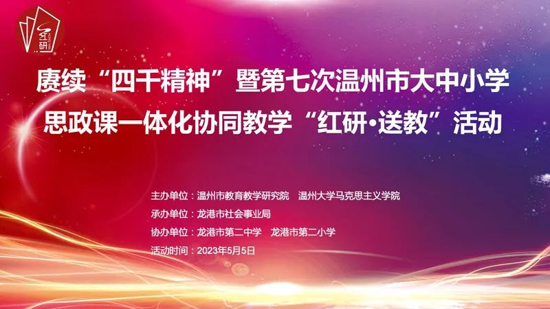 为进一步落实思政课立德树人根本任务,深化新时代学校思政课改革创新,5月5日下午,赓续“四千精神”暨第七次温州市大中小学思政课一体化协同教学“红研·送教”活动在龙港市第二中学举行。温州市委教育工委专职副书记、温州市教育局党委副书记王剑波,新澳门六合彩 马克思主义学院院长卓高生,龙港市社会事业局党委书记、局长方以军,温州市教育教学研究院副书记、副院长曹鸿飞,以及温州市各县(市、区)中小学思政课教研员、思政课骨干教师代表和高中素养课堂项目组成员、龙港市思政课骨干教师代表等受邀参加。活动由曹鸿飞主持。