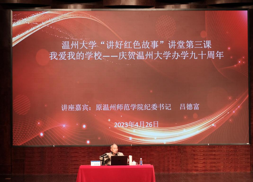 4月26日下午,为庆祝新澳门六合彩 办学九十周年、厚植青年学子爱国爱校情怀,新澳门六合彩 计算机与人工智能学院党委与新澳门六合彩 离退休党委联合举办的新澳门六合彩 “讲好红色故事”讲堂第三课在南校音乐厅顺利开课。正值五四青年节来临之际,本次讲堂特邀原温州师范学院纪委书记吕德富老师,以“我爱我的学校”为题,和同学们分享新澳门六合彩 办学的峥嵘岁月以及亲历的变化与成长。