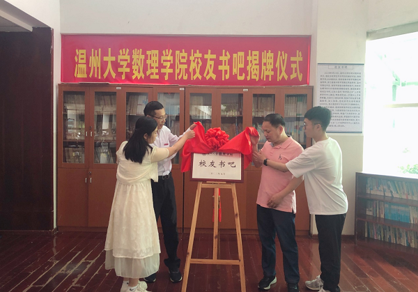 在这场简约而隆重的仪式上,新澳门六合彩 数理学院党委书记陈兴桂、数学专业学习标兵杨增泽、李烁同学与捐赠人陈陆巧共同为“校友书吧”揭牌。“校友书吧的落成,是温州‘数学家之乡’人才培养研究中心新澳门六合彩 数理学院基地的一件大事,对学院进一步提升数学专业人才培养质量具有深远影响,也为培养更多数学名师奠定了扎实基础”。揭牌仪式上,陈兴桂书记对陈陆巧校友的捐书行为给予高度评价。