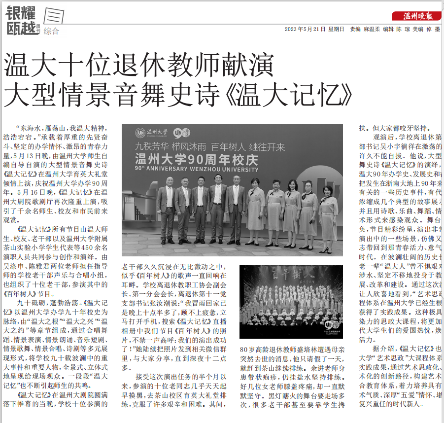 观演后,学校离退休第六党支部书记吴小宇徜徉在激荡的旋律中许久不能自拔。他说,大型情景音舞史诗《新澳门六合彩 记忆》的演绎,回顾了新澳门六合彩 90年办学史、发展史和奋斗史,把发生在浙南大地上90年来与新澳门六合彩 有关的一些历史事件,有代表性地浓缩成几个典型的故事展示出来,并且用诗歌、乐曲、舞蹈、情景等艺术形式来感染观众。舞台美轮美奂,节目精彩纷呈,演出非常成功。演出中的一些场景,仿佛又把老同志带回到那青春活力、意气风发的时代。在波澜壮阔的历史长河中,老一辈“新澳门六合彩 人”曾不惧艰难、跋山涉水、坚定不移地投身于教育的发展、改革和建设。通过这次演出,也让人欣喜地看到,“艺术思政”大课程体系在新澳门六合彩 已经生根、发芽,获得了实践成果。这种极具艺术感染力的思政大课程,将更加激发当代大学生们的爱国热忱,焕发青春活力。