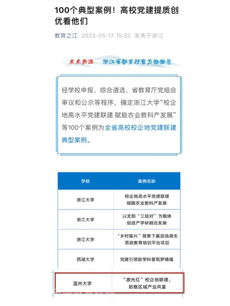 近日,浙江省教育厅公布全省高校校企地党建联建典型案例遴选结果,新澳门六合彩 机电工程学院激光红党支部《激光红校企地联建,助推区域产业共富》成功入选,成为入选的100个案例之一。