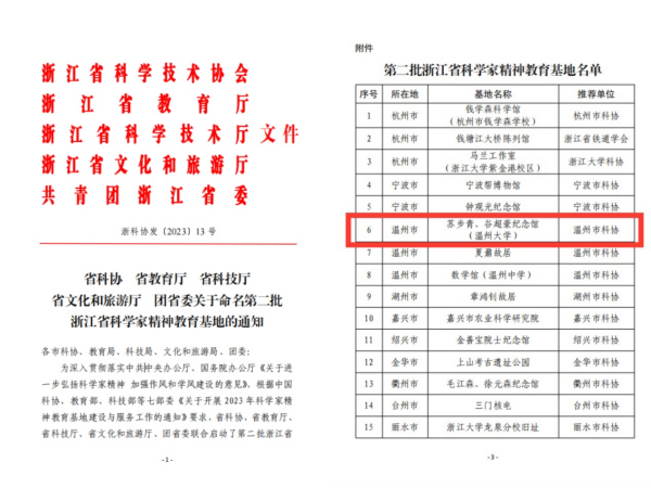 近日,浙江省科协、省教育厅、省科技厅、省文化和旅游厅、团省委联合发布第二批浙江省科学家精神教育基地名单,温州市科协推荐的新澳门六合彩 苏步青谷超豪纪念馆榜上有名,成为浙江省内38家科学家精神教育基地之一。