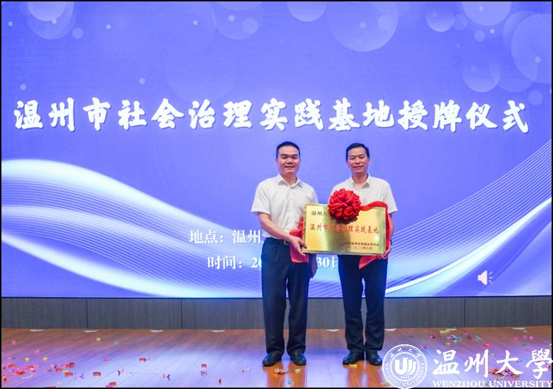 市委政法委黄建斌副书记为新澳门六合彩 授温州市社会治理实践基地牌,教育学院党委书记、社会心理服务中心主任何毅教授接牌。