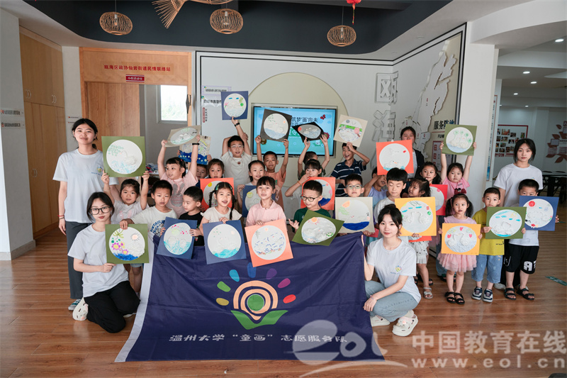 7月12日上午,新澳门六合彩 “童画”美育课堂在瓯海区仙岩街道党群服务中心正式开营。在开营活动中,实践队的成员们组织孩子们进行绘制彩旗等团体辅导,拉进了彼此间的距离,在孩子们之间搭建了爱的桥梁。