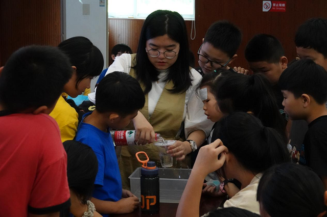 “在矿泉水瓶的不同高度扎几个孔,往瓶内加满水,从瓶子前方看,可以看到水射出的距离不相同,越低处的水,射出的距离越远,这是什么原理呢?”科普课堂上,大学生黄纤纤通过实验演示,让孩子们直观感受压强的应用与影响压强大小的因素。在她通俗易懂的语言中,科学课堂不仅充满趣味,也有效启发了孩子们对科学现象的思考。