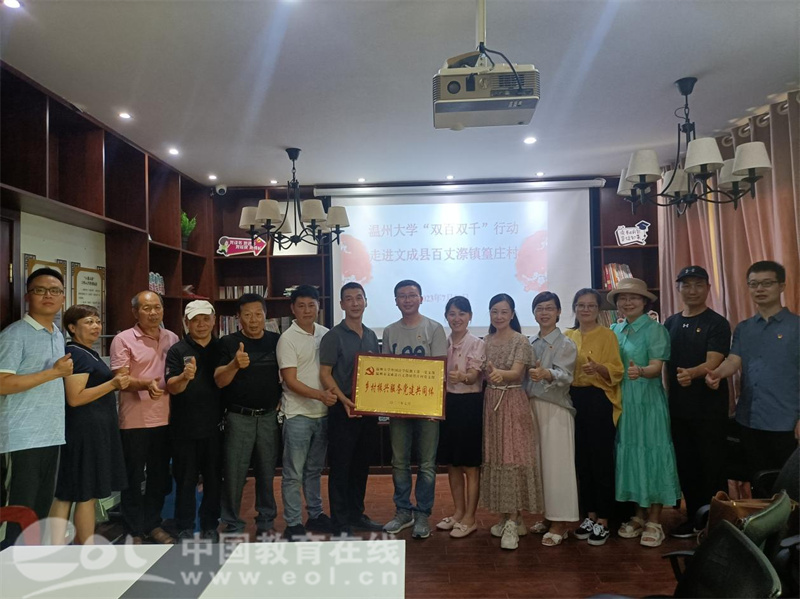 为进一步落实“双百双千”行动计划,推动乡村振兴,强化党建引领服务地方功能,7月10日,在学院党委书记杨丽君带领下,新澳门六合彩 外国语学院教工第一党支部的党员老师们以及逐梦瓯越、青苗优师社会实践队的同学们一起深入温州市文成县百丈漈镇篁庄村,开展了以“学思想、当先锋、促践行”服务乡村振兴“双百双千”主题党日活动,成功举办了外院教工第一党支部与篁庄村党支部乡村振兴服务党建共同体成立仪式,并为乡村儿童带去一堂丰富有趣的中英双语戏剧课。