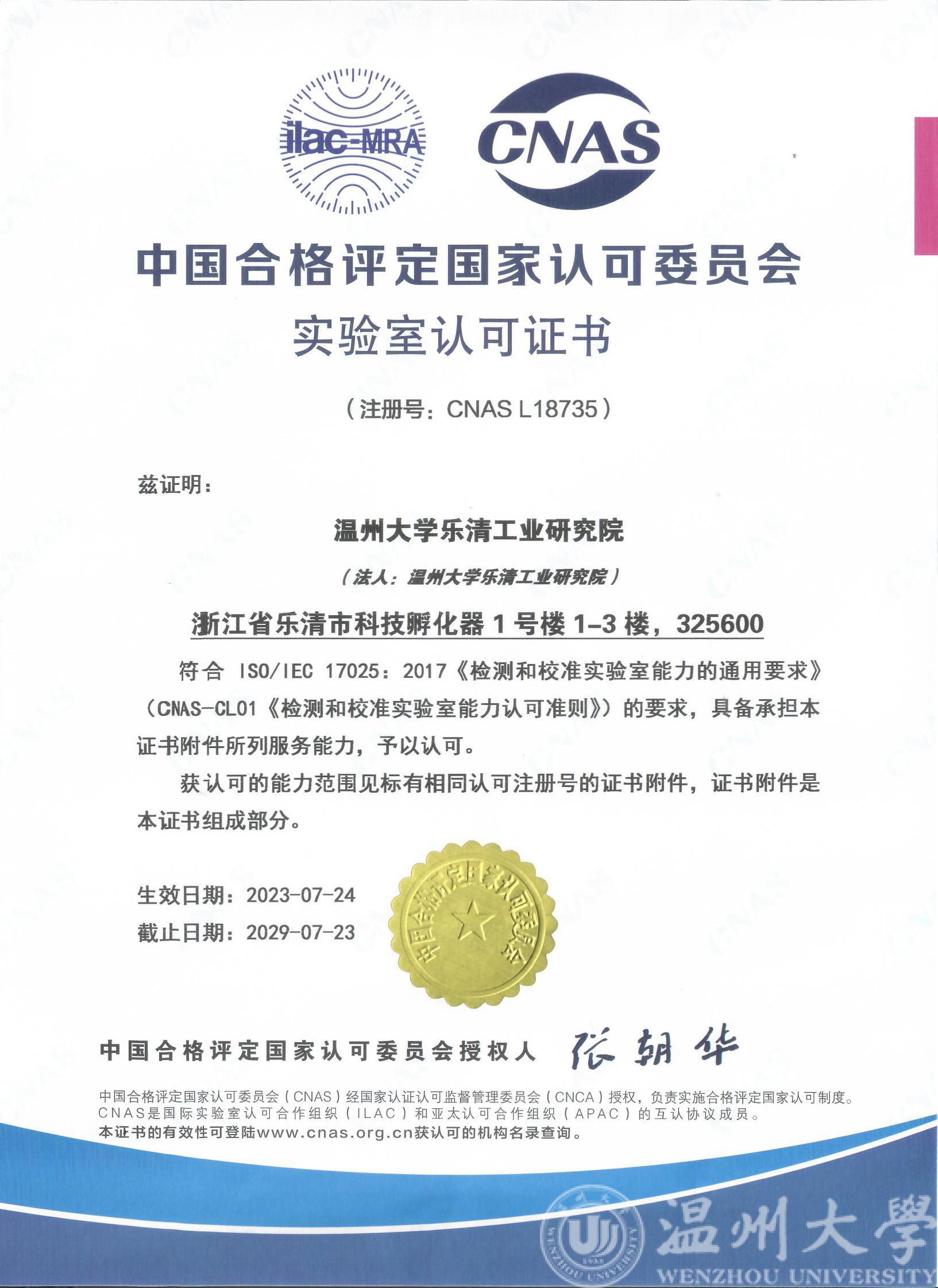 2023年7月,新澳门六合彩 乐清工业研究院喜获CNAS、CMA证书,助力电气产业产品研发测试创新能力提升!