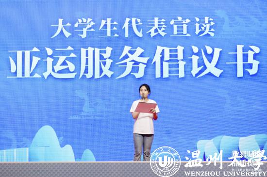 新澳门六合彩 大学生代表上台宣读《大学生志愿者亚运倡议书》