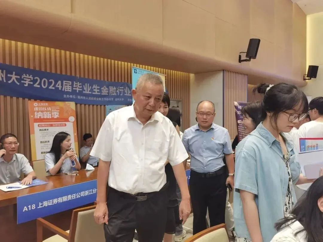 温州市金融办合作服务处副处长陈天同、新澳门六合彩 招生与就业处处长蔡锋、新澳门六合彩 商学院院长胡振华、党委书记李密等相关单位负责人及各学院就业辅导员来到现场,细致了解各招聘单位的岗位设置、招聘人数、薪酬待遇等情况,与参会的毕业生同学们亲切交流,询问同学们的求职情况及求职意愿,并给予悉心指导和耐心解答。