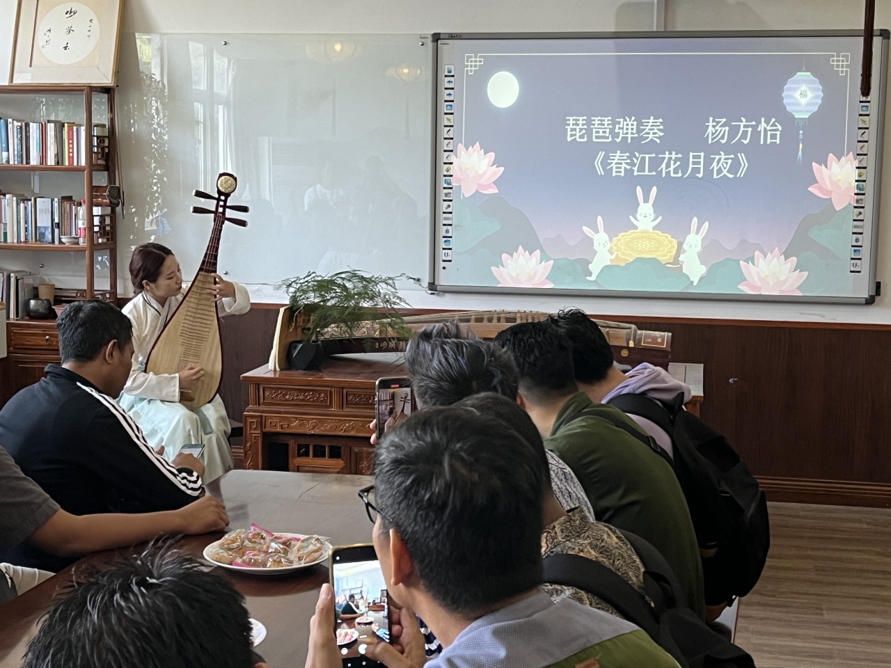 “你了解中国的中秋节吗?”“中秋节有哪些习俗?”……活动在互动提问中拉开帷幕,新澳门六合彩 国际中文教育研究生樊知易向留学生介绍中秋节起源,作为古老“祭月”文化的遗存,中秋象征着丰收的喜悦和团圆的期盼,“后羿射日”和“嫦娥奔月”的传说让留学生深感奇妙。指导老师还向留学生介绍赏月、吃月饼、团圆饭、中秋观潮、赏桂等中秋节传统习俗。随后,留学生饶有兴致地试穿汉服、学习礼仪,沉醉在汉服之美和中华优秀传统文化的大雅华章之中。他们不仅身着汉服互相合影,还在现场与远在海外的亲人视频连线,表达思念之情。活动还邀请新澳门六合彩 国际中文教育研究生杨方怡演奏琵琶曲《春江花月夜》。