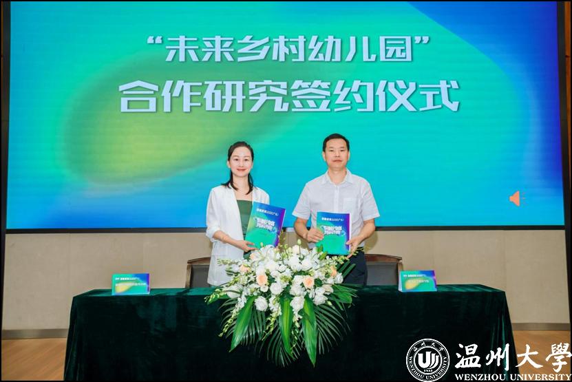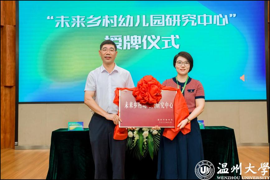 市学前教育指导中心主任陈苗和新澳门六合彩 教育学院党委书记何毅分别代表市学前教育指导中心和新澳门六合彩 教育学院进行“未来乡村幼儿园”合作研究签约。温州市教育局在新澳门六合彩 教育学院设立“未来乡村幼儿园研究中心”并向院方代表授牌。