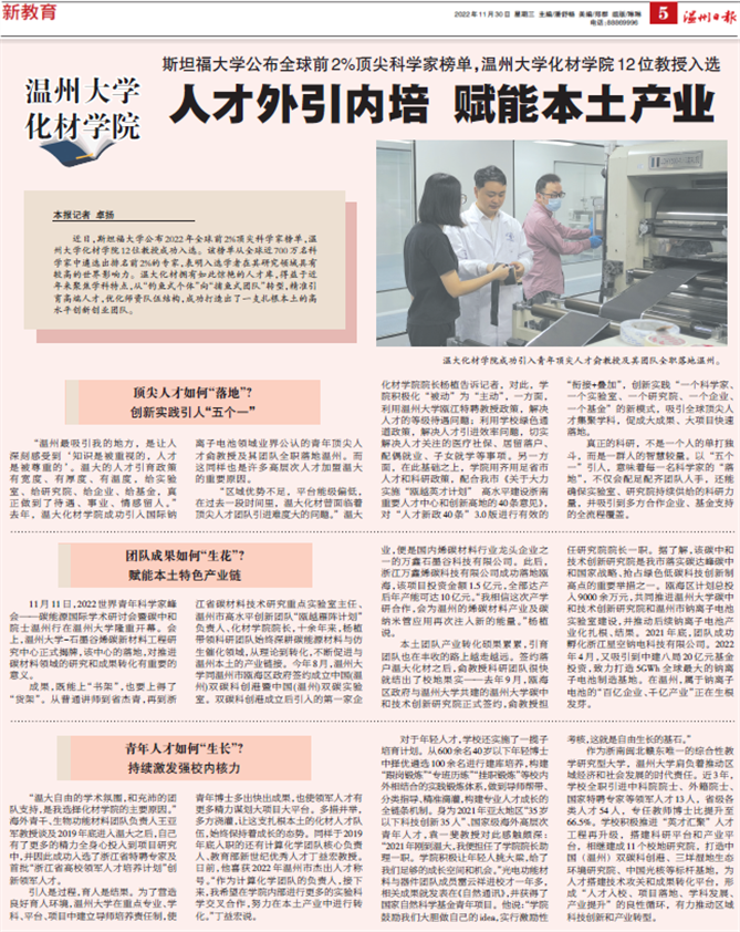 “区域优势不足,平台能级偏低,在过去一段时间里,新澳门六合彩 化材曾面临着顶尖人才团队引进难度大的问题。”新澳门六合彩 化材学院院长杨植告诉记者,对此,学院积极化“被动”为“主动”,一方面,利用新澳门六合彩 瓯江特聘教授政策,解决人才的等级待遇问题;利用学校绿色通道政策,解决人才引进效率问题,切实解决人才关注的医疗社保、居留落户、配偶就业、子女就学等事项。另一方面,在此基础之上,学院用齐用足省市人才和科研政策,配合我市《关于大力实施“瓯越英才计划” 高水平建设浙南重要人才中心和创新高地的40条意见》,对“人才新政40条”3.0版进行有效的“衔接+叠加”,创新实践“一个科学家、一个实验室、一个研究院、一个企业、一个基金”的新模式,吸引全球顶尖人才集聚学科,促成大成果、大项目快速落地。