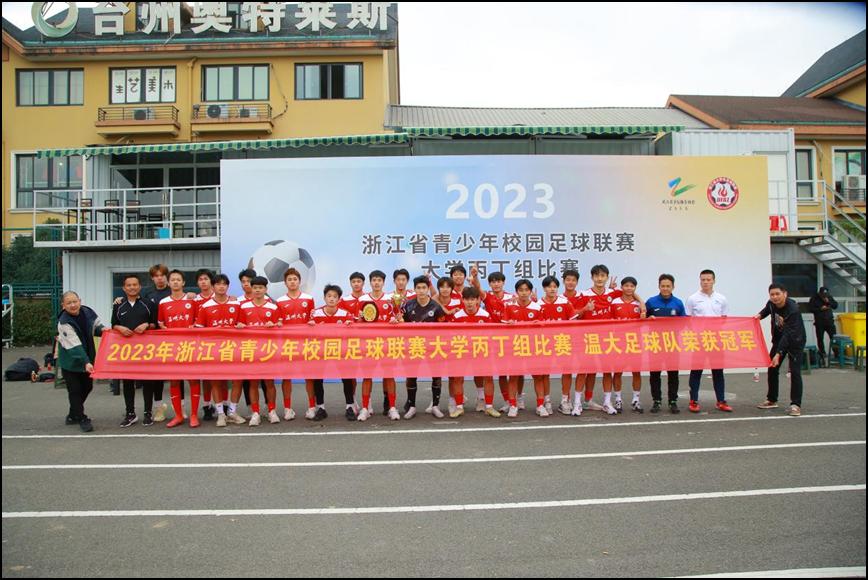 11月7日,2023浙江省青少年校园足球联赛大学丙丁组比赛在台州市黄岩区落下帷幕,新澳门六合彩 鹿呦男子足球队奋力拼搏,以五战全胜的战绩勇夺男子丙组比赛冠军。体育与健康学院教练林辉老师荣获“优秀教练员”荣誉称号、队长潘柱豪获本次联赛唯一“最佳门将”称号、队员董文晖获“最佳射手”荣誉称号、队员叶旭凯、许晨、饶文韬、舒安获“优秀运动员”荣誉称号。