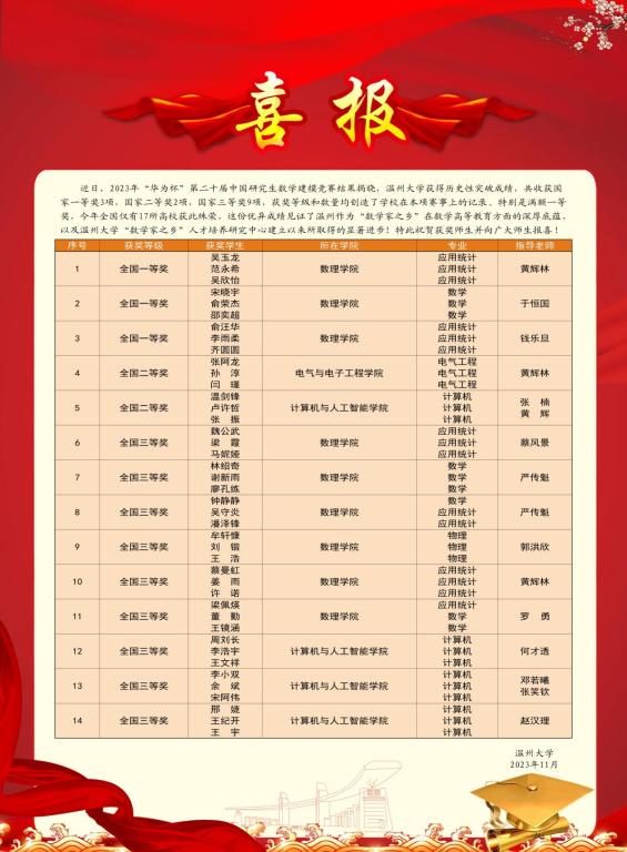 据悉,由于赛制规定,一个参赛学校最多只能获得3项国家一等奖,今年全国仅有17个高校获得满额。此次殊荣体现了温州作为“数学家之乡”在数学高等教育方面的深厚底蕴,见证了新澳门六合彩 “数学家之乡”人才培养研究中心建立以来所取得的显著进步,也显示了新澳门六合彩 近年来加强数学建模教学和培训团队建设的具体成果。