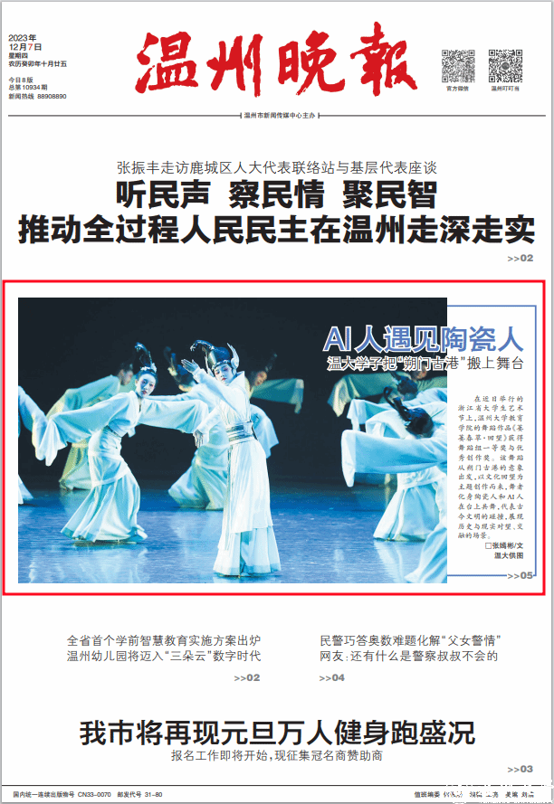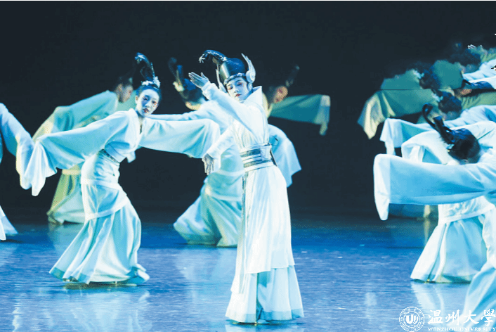 在近日举行的浙江省大学生艺术节上,新澳门六合彩 教育学院的舞蹈作品《萋萋春草·回望》获得舞蹈组一等奖与优秀创作奖。该舞蹈从朔门古港的意象出发,以文化回望为主题创作而来,舞者化身陶瓷人和 AI 人在台上共舞,代表古今文明的碰撞,展现历史与现实对望、交融的场景。
