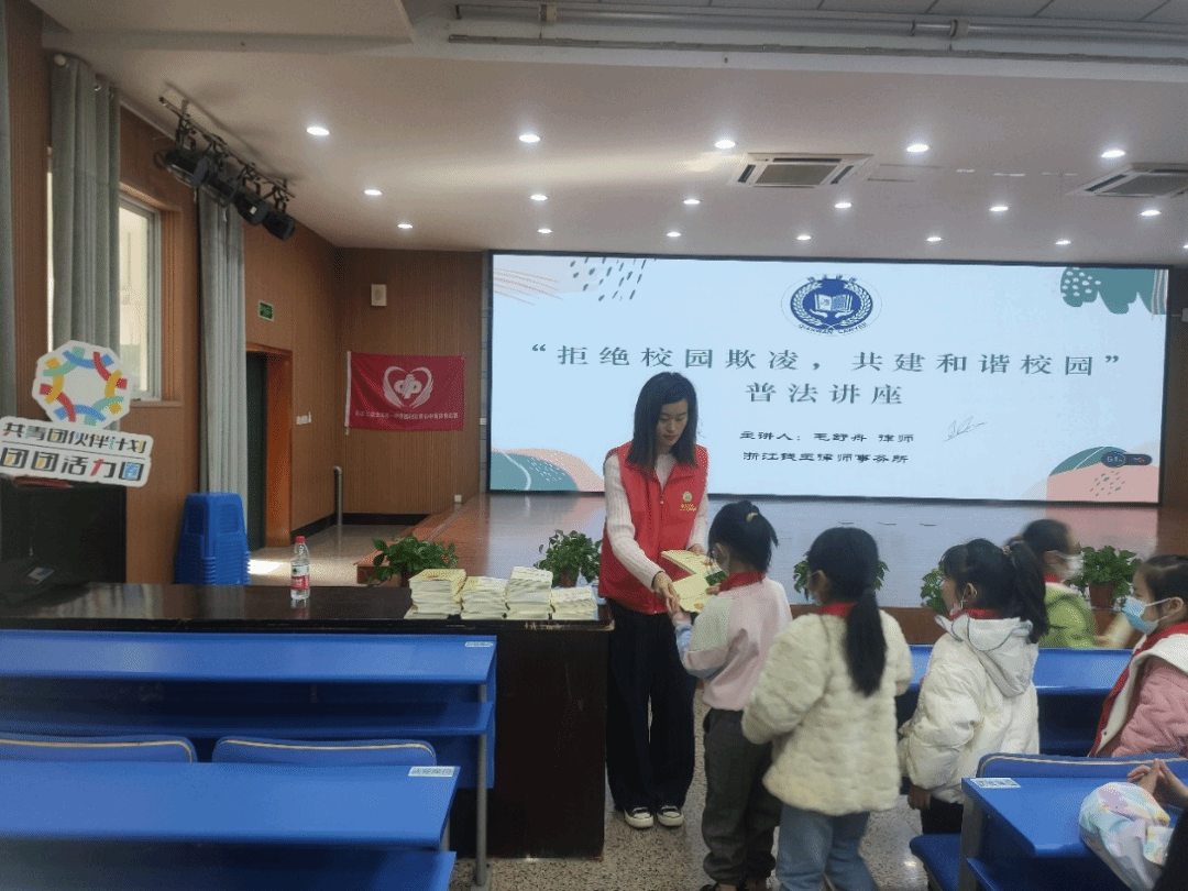 杭州市临安区青山湖科技城第一小学联合公益组织给师生开出了一堂“拒绝校园欺凌,共建和谐校园”普法讲座,并向学生发放《中华人民共和国未成年人保护法》一书。