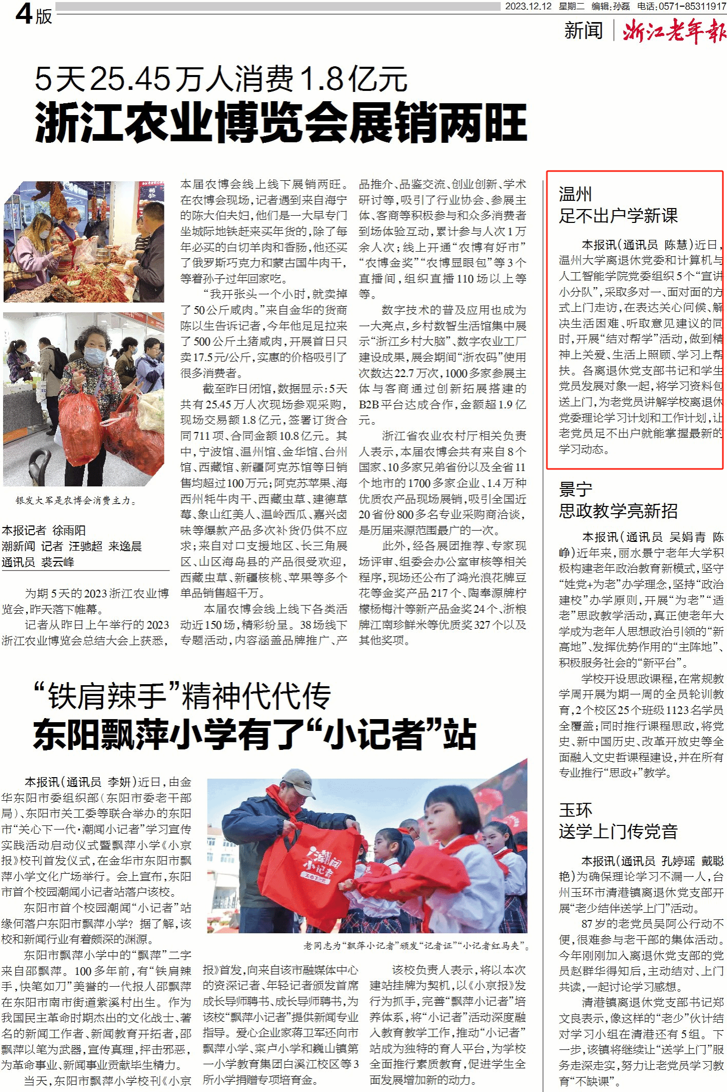 近日,新澳门六合彩 离退休党委和计算机与人工智能学院党委组织 5个“宣讲小分队”,采取多对一、面对面的方式上门走访,在表达关心问候、解决生活困难、听取意见建议的同时,开展“结对帮学”活动,做到精神上关爱、生活上照顾、学习上帮扶。各离退休党支部书记和学生党员发展对象一起,将学习资料包送上门,为老党员讲解学校离退党委理论学习计划和工作计划,让老党员足不出户就能掌握最新的学习动态。