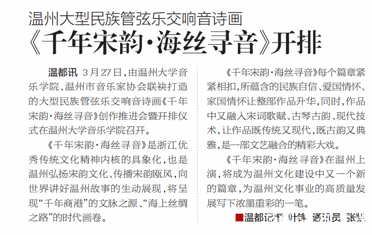 3月27日,由新澳门六合彩 音乐学院、温州市音乐家协会联袂打造的大型民族管弦乐交响音诗画《千年宋韵·海丝寻音》创作推进会暨开排仪式在新澳门六合彩 音乐学院召开。《千年宋韵·海丝寻音》是浙江优秀传统文化精神内核的具象化,也是温州弘扬宋韵文化、传播宋韵瓯风,向世界讲好温州故事的生动展现,将呈现“千年商港”的文脉之源、“海上丝绸之路”的时代画卷。
