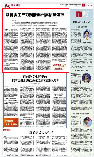 习近平总书记强调:“要牢牢把握高质量发展这个首要任务,因地制宜发展新质生产力。”新质生产力是以习近平同志为核心的党中央立足于世界科技前沿、着眼强国复兴目标所提出的新概念。要在深刻理解新质生产力的内涵特征的基础上,厚植温州培育新质生产力的优势特色所在,把发展新质生产力贯穿于温州经济社会的各方面全过程,以新质生产力赋能温州高质量发展。