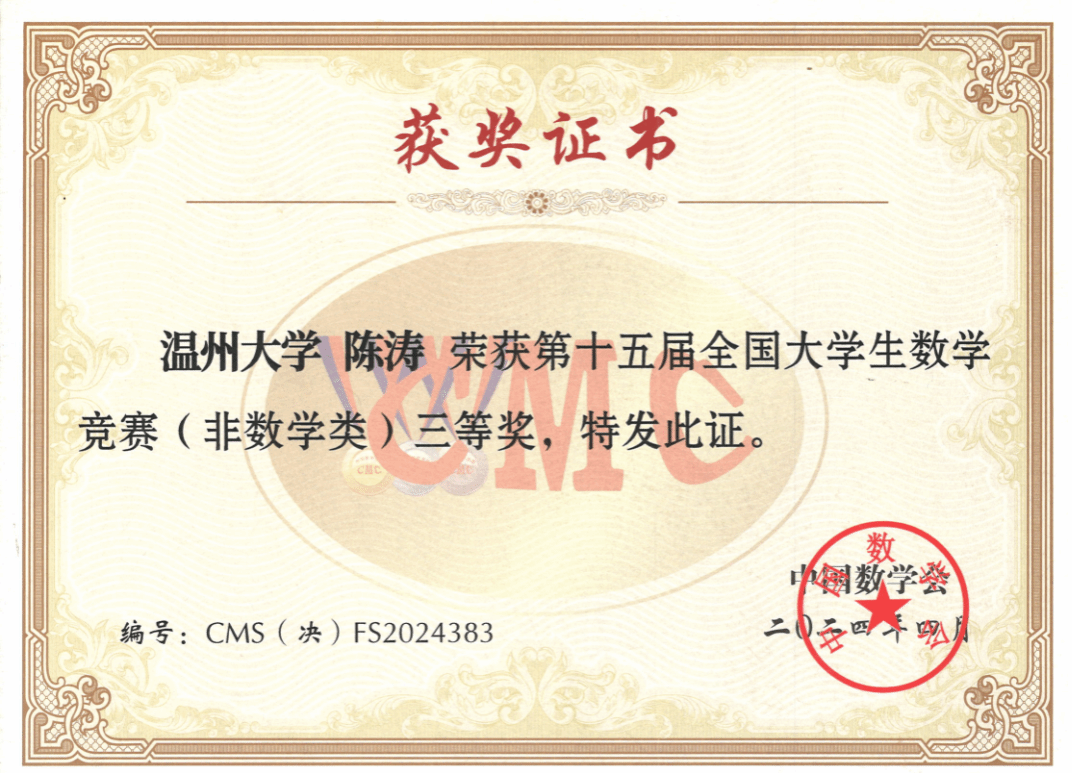 陈涛,高中毕业于台州温岭新河中学。陈涛介绍,自己的高数基础并不算很好,此次获奖主要得益于老师们的精心指导,以及自己平时经常刷985院校的考研数学真题,并对解题方法进行总结。他认为在数学学习方面要多总结多复盘,另外限时训练也很有必要。