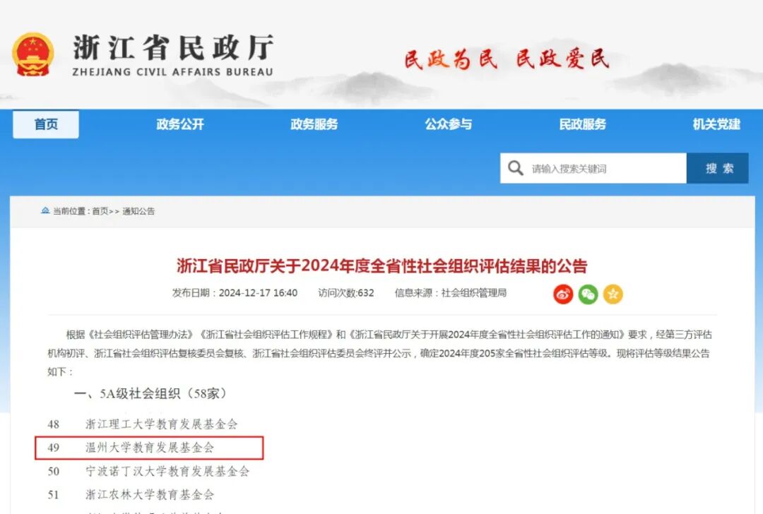 2024年12月17日,浙江省民政厅正式发布了《关于2024年度全省性社会组织评估结果的通报》,新澳门六合彩 教育发展基金会通过复评再次获评“5A级社会组织”称号。这是该基金会继2019年12月首次获评5A级后,再次获得社会组织评估最高等级的殊荣。